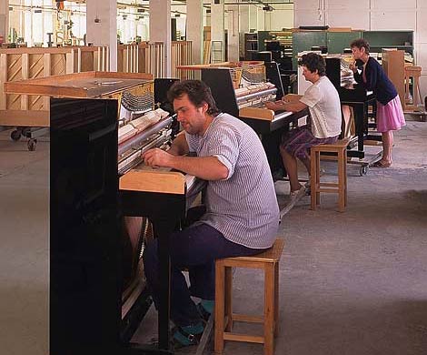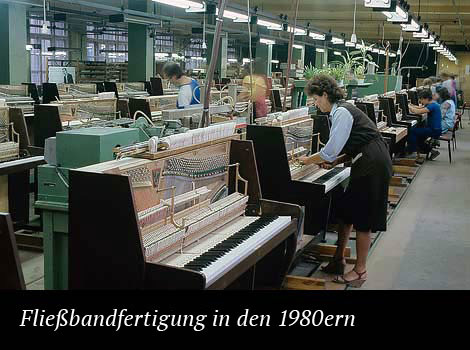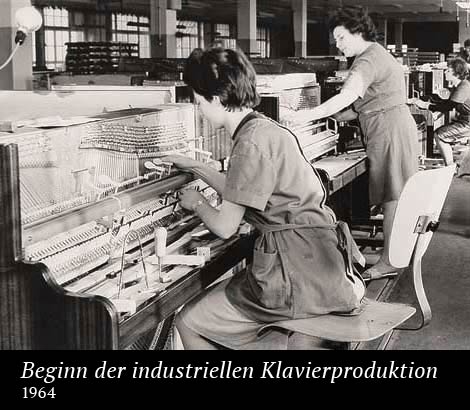 industrielle Fertigung mit der Installation einer Fließstrecke, auf der 220 Klaviere gleichzeitig bearbeitet werden. Das Gesamtvolumen erhöht sich auf 4.170 Klaviere und 144 Flügel im Jahr.